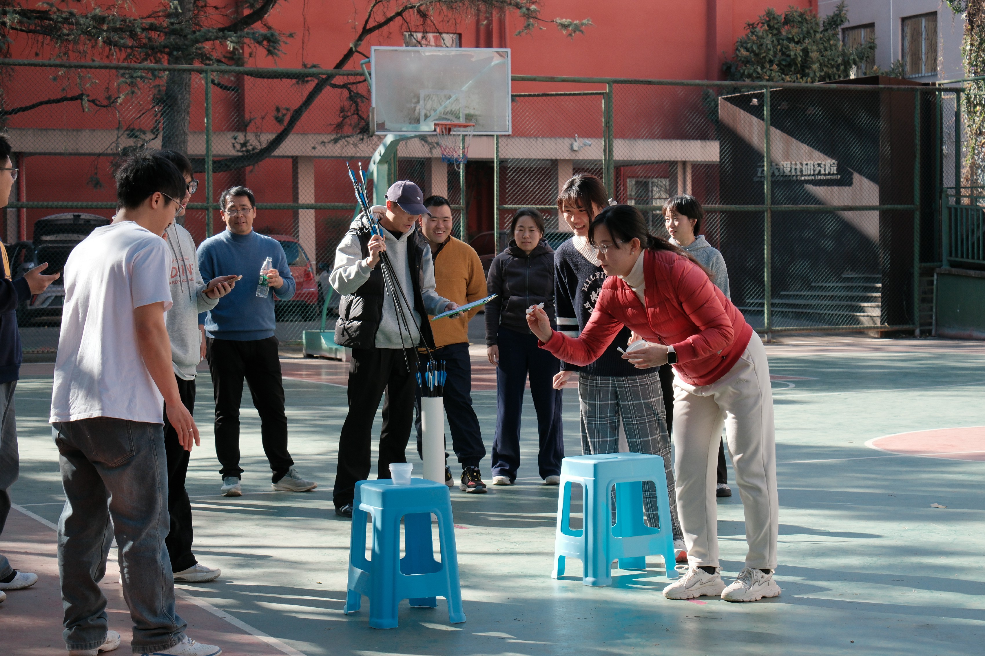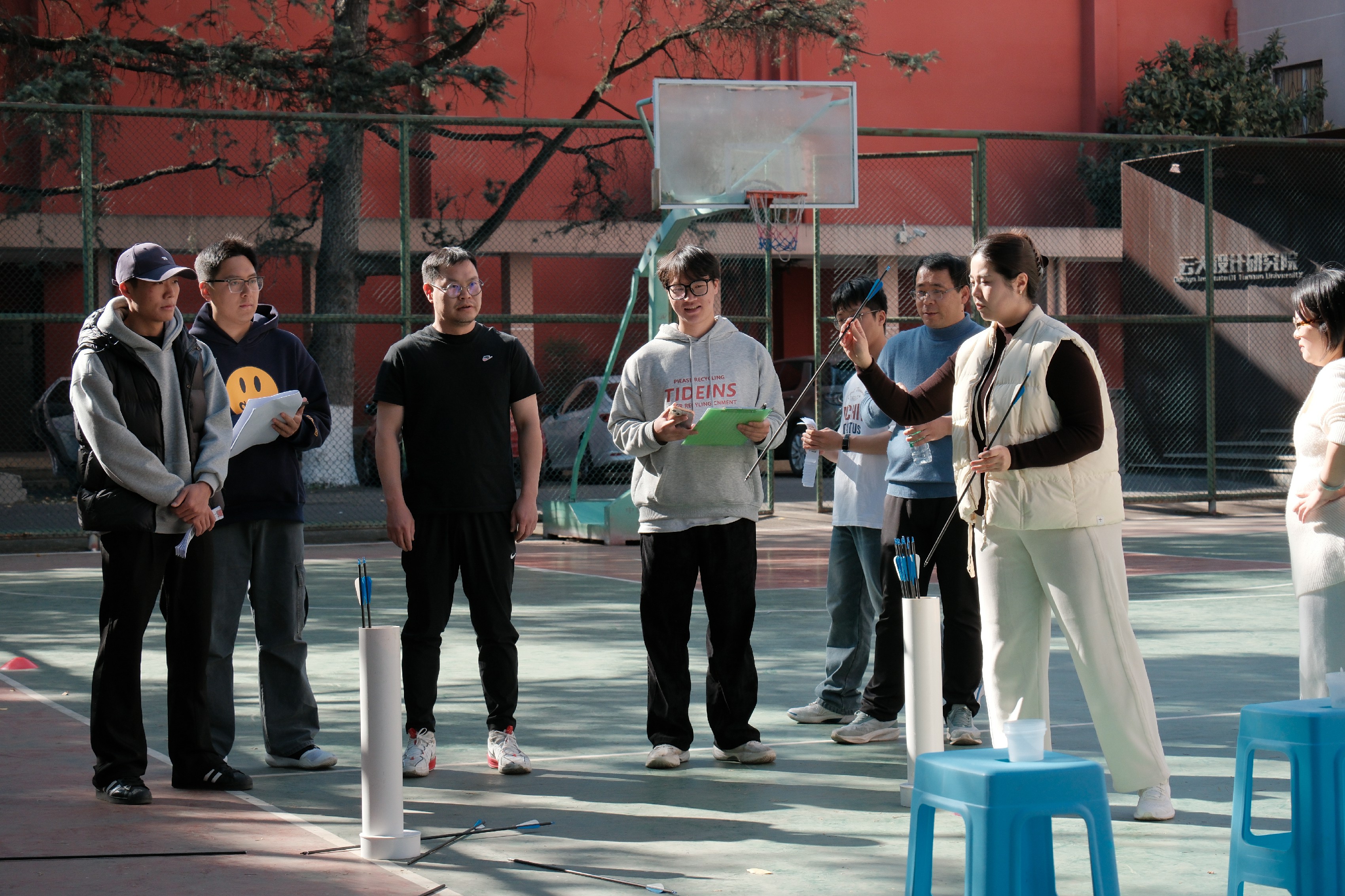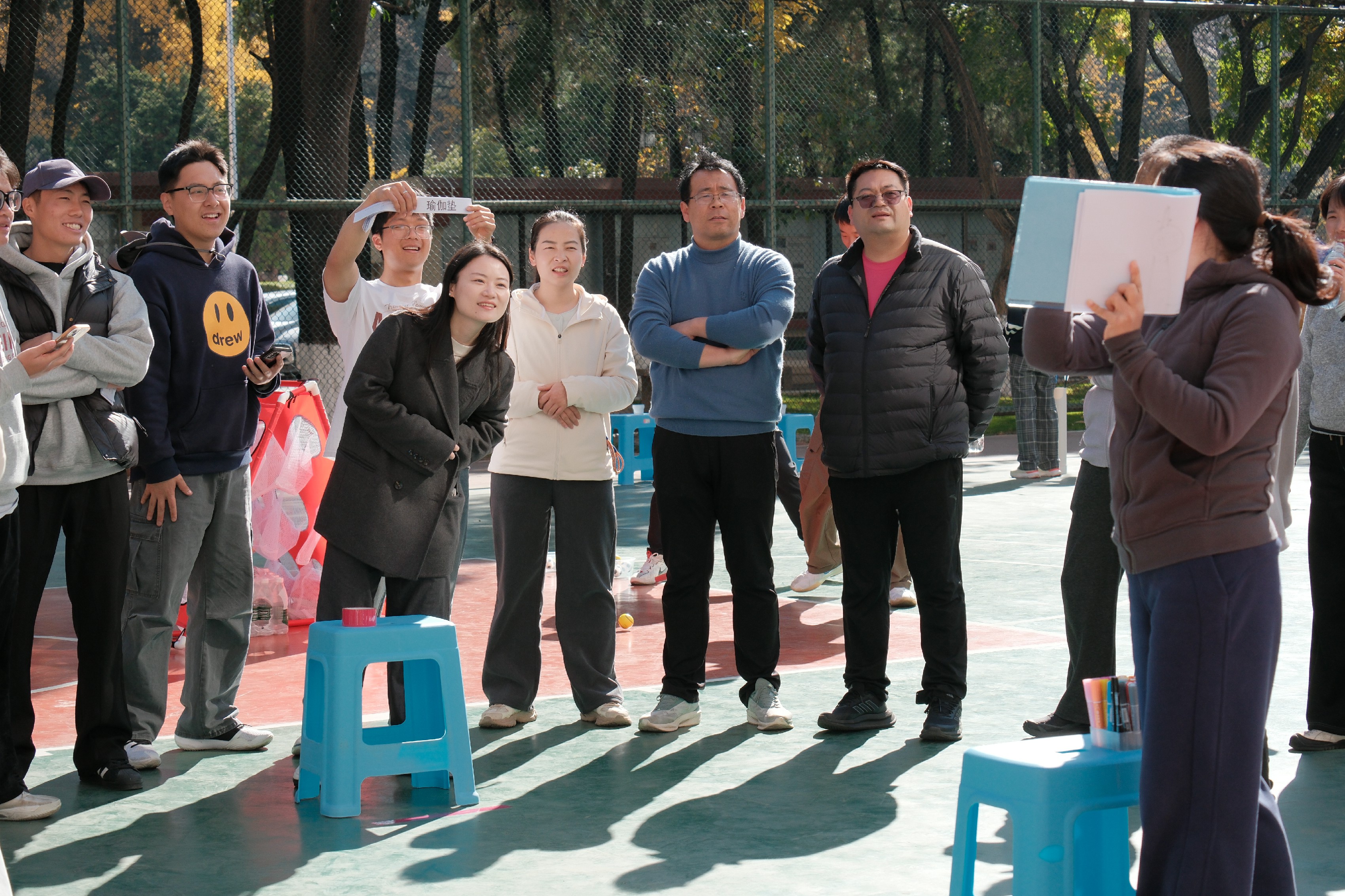 为让活动兼具趣味性与参与感,同时体现学院工会的“艺术运动”的特色,工会委员团队提前筹备,从场地规划、道具采购到赛程安排、规则制定,每一个细节都反复推敲、细致落实。此次赛事在往届趣味项目和半场篮球对抗赛的基本模块中,提升了趣味项目的“艺术性”,增加“你画我猜”的协同项目,同时邀请学院青年学子加入,开展师生友谊篮球对抗赛。既满足了教职工对竞技乐趣的追求,也兼顾了团队协作的互动体验。赛前,学生裁判组耐心细致地为参赛教职工讲解各项目规则、注意事项,工会还贴心准备了饮用水、急救包等物资,全力保障赛事安全有序开展。