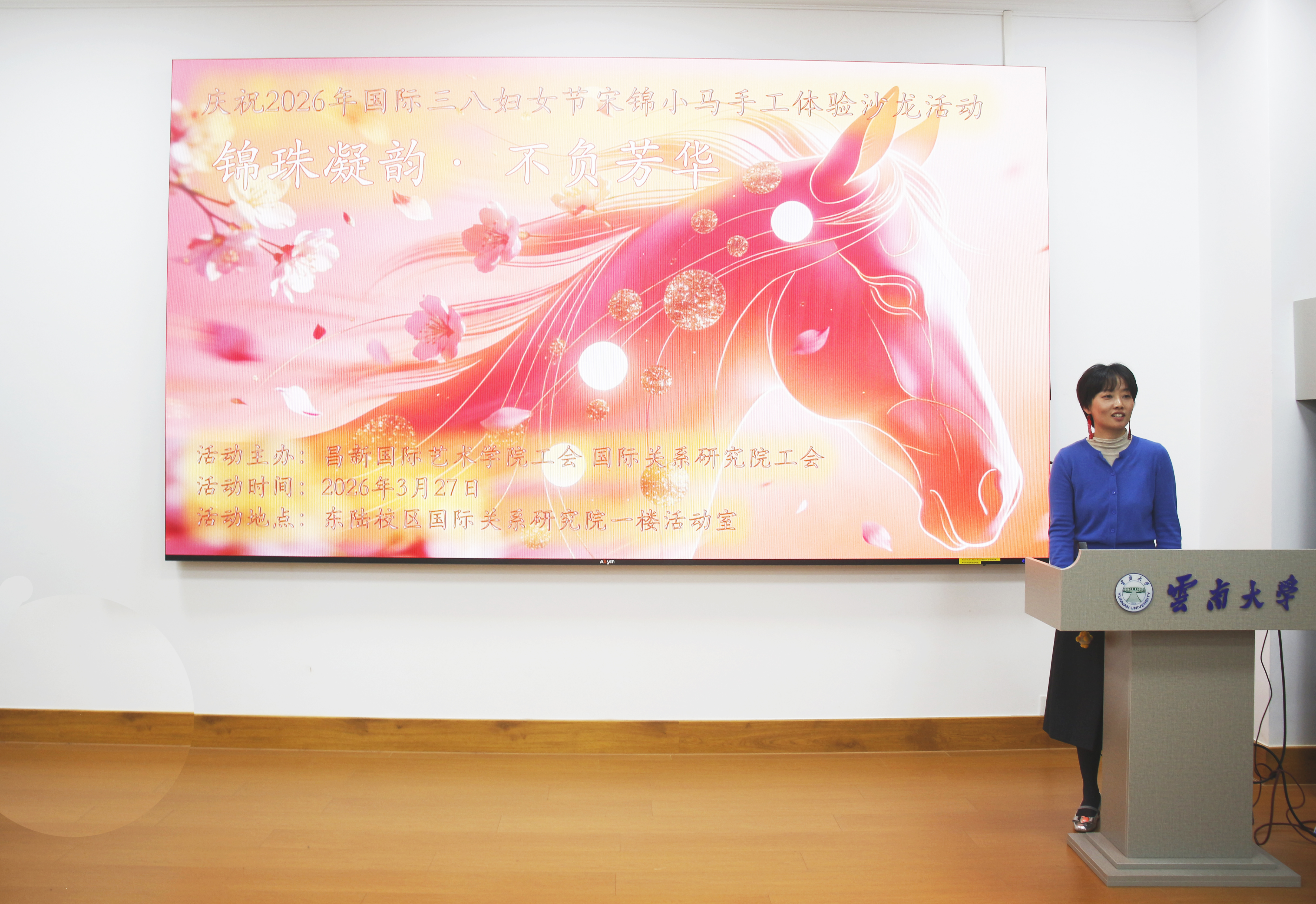 为庆祝2026年国际三八妇女节,丰富女教职工的精神文化生活,传承非遗宋锦文化,同时搭建跨部门的交流平台,云南大学昌新国际艺术学院工会与国际关系研究院工会联合开展了以“锦珠凝韵・不负芳华”为主题的宋锦小马珍珠拼贴手工体验活动。活动于3月27日在东陆校区国际关系研究院1楼活动室举办,并获得云南大学昌新国际艺术学院思艺美育工作室支持,两院多名女教职工参与。活动全程氛围温馨、互动热烈,收获了大家的一致好评,圆满达成了文化传承、身心放松、团队凝聚的预期目标。