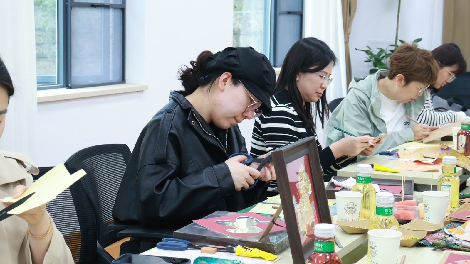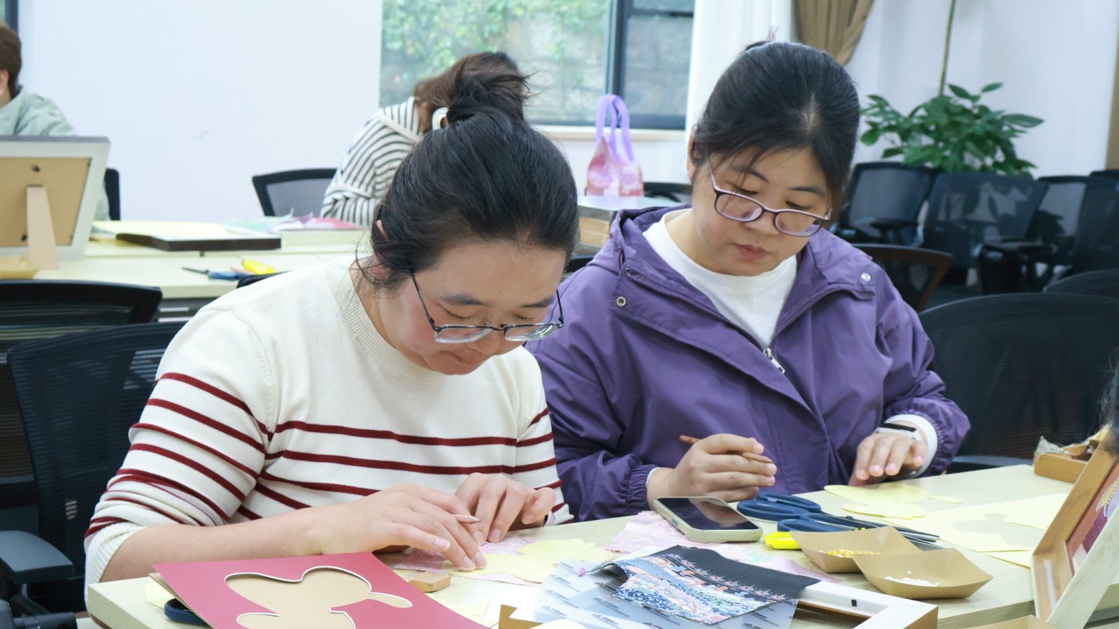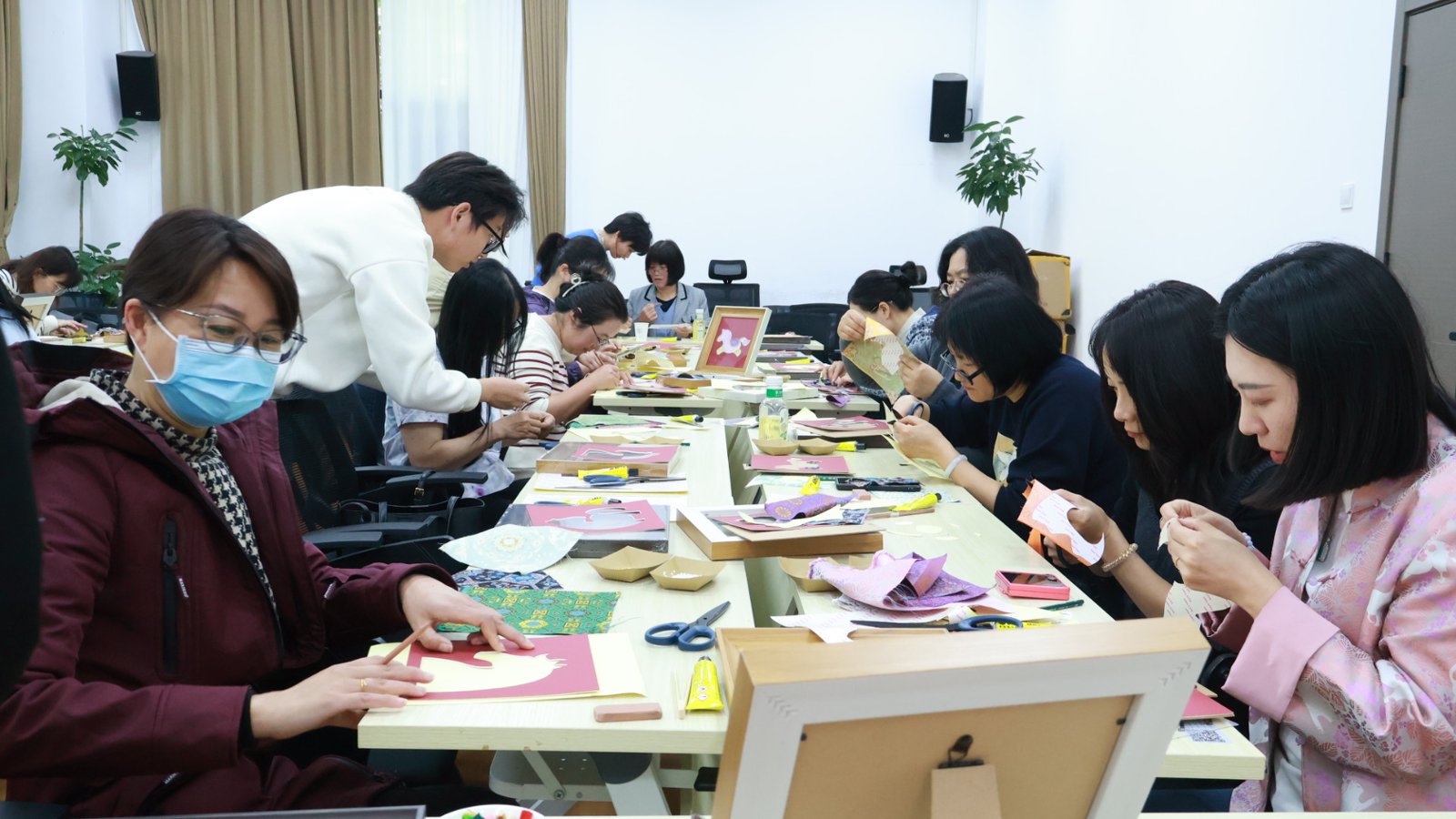 活动前期,两院工会高度重视、协同推进,专门成立了专项工作组统筹各项筹备工作。工作组精准完成参与人员统计,提前发布活动须知明确参与细节;挑选了环境温馨的活动场地,合理划分出制作区和茶歇交流区,为大家营造舒适的创作和交流氛围;提前采购并摆放好宋锦、珍珠、小钻等制作物料,同时对接好专业主讲老师、4 名助教学生以及摄影人员,组建了专业的指导团队。此外,安排专人负责现场组织,全程跟进签到、授课、创作等各个环节,及时响应教职工的各类需求,为活动的顺利开展筑牢了基础。