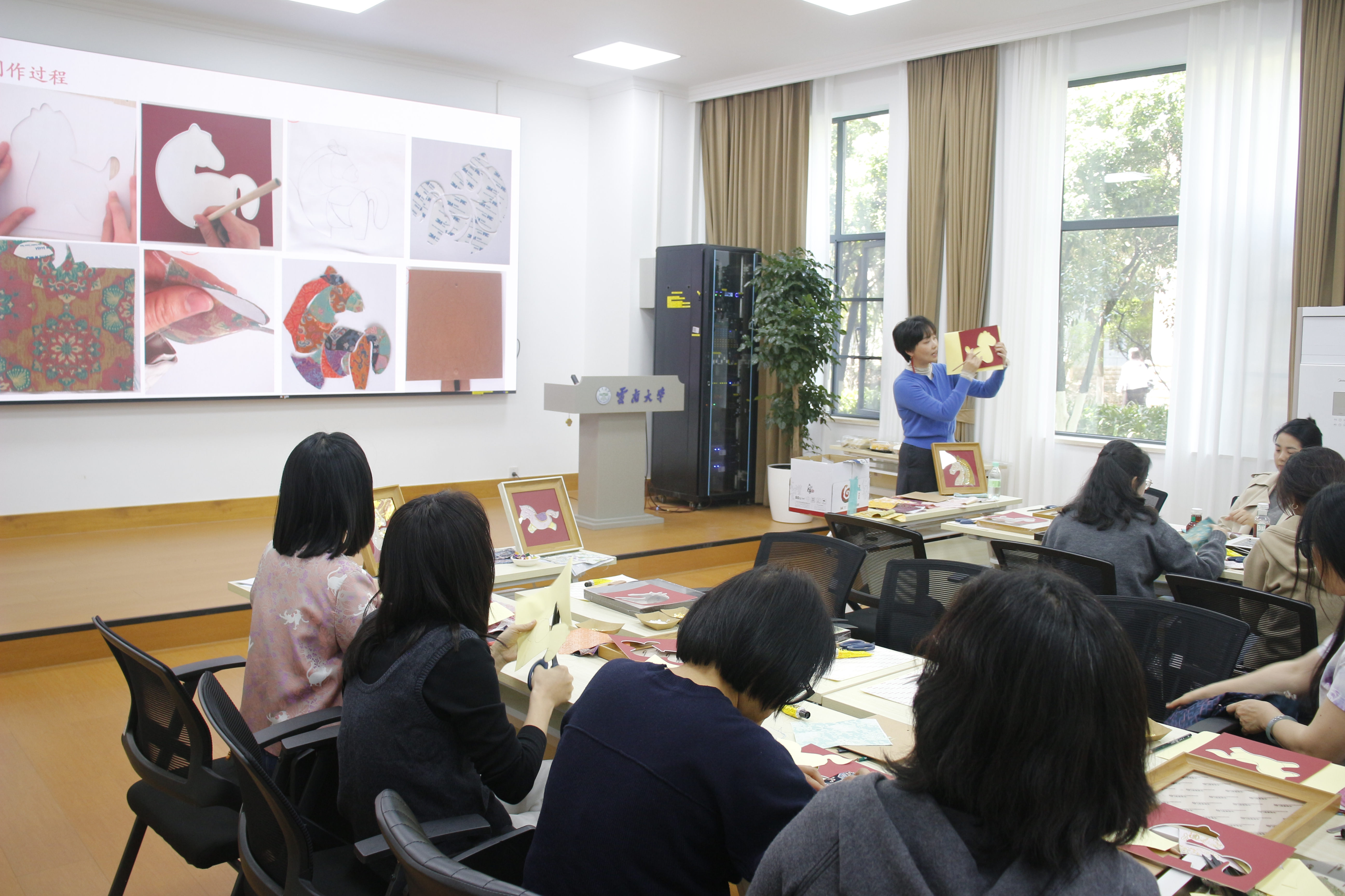 本次活动紧扣三八妇女节主题,结合2026马年生肖特色,以非遗宋锦文化为核心,创新设计活动流程,各个环节紧凑有序、衔接顺畅。活动开始后,工会主办方先进行简短致辞,随后主讲老师围绕宋锦文化渊源、选材搭配、粘贴技巧等内容,开展理论讲解和技法教学。之后进入核心的手工创作环节,教职工们在老师和助教的耐心指导下,充分发挥巧思和创意,亲手制作宋锦小马装饰作品。